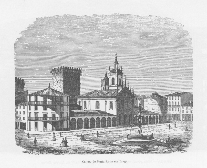 "Mandaram-nos debaixo dum renque de arcos, no Campo de Sant' Ana, onde a mão civilizadora, em 1836, salvo erro, colocou o primeiro e único boletim bracarense. Lembra-me, faz hoje cinco anos, ver ali no batente daquela porta um molho de palha painça pendurado. Neste tempo, o botequim não era exclusivo do animal bípede; o viageiro podia almoçar e mais o azemel na mesma locanda; o armário da cavaca e de pão-podre [é o pão-de-ló de outras terras] fornecia o grão e a palha para os dois fregueses económicos. Hoje, não. A botequineira, instrumento involuntário do epigrama aos seus conterrâneos, deixou de acumular os dois géneros de consumo, e desta vez não vendia palha, pelo menos com cartaz à porta. Em compensação, as suas estantes de legítimo pinho amarelo, medraram em aguardente de medronhos, licor de canela e laranjas azedas".